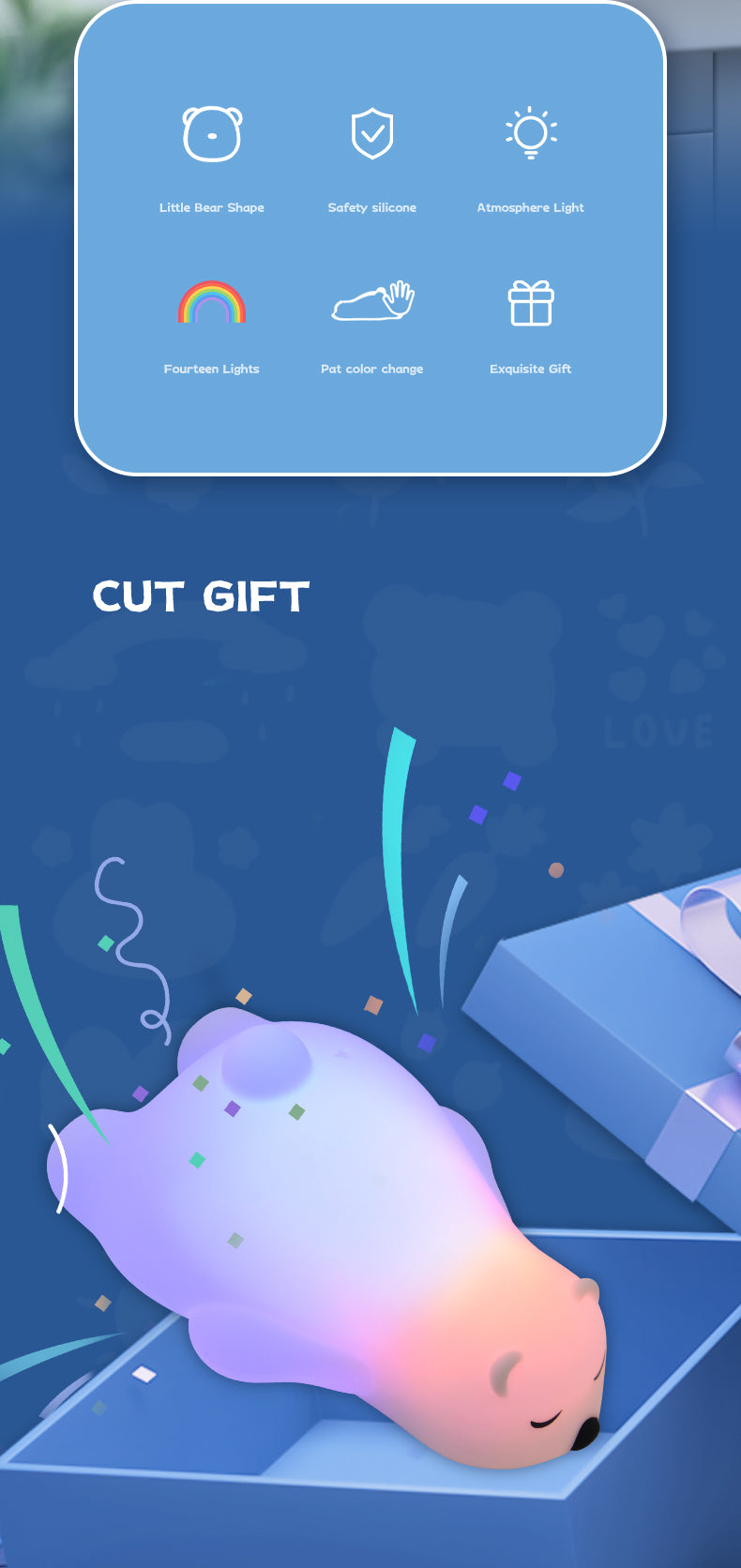 Keywords included: bear night light, silicone LED lamp, USB rechargeable nursery lamp, dual-color mood light, animal-shaped kids light, bedtime sleep aid, portable baby light, kawaii room decor, soft night light for children