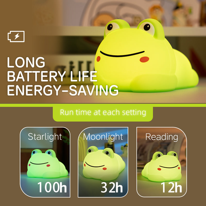 Adorable Frog Silicone Night Light – A soft, safe, and rechargeable bedside lamp designed with a cute frog shape. Features warm white & RGB color modes, tap control, built-in music, and a 30-min timer to help kids sleep better. Perfect for children’s bedrooms, nurseries, and unique gift ideas. Portable, durable, and easy to use with USB charging.
